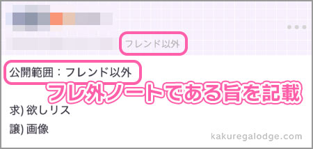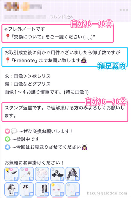 交換内容がわからなくなる、取引がストップするなどに繋がるため、わかりやすい場所に「フレンド外ノートです」と書くのがおすすめです。